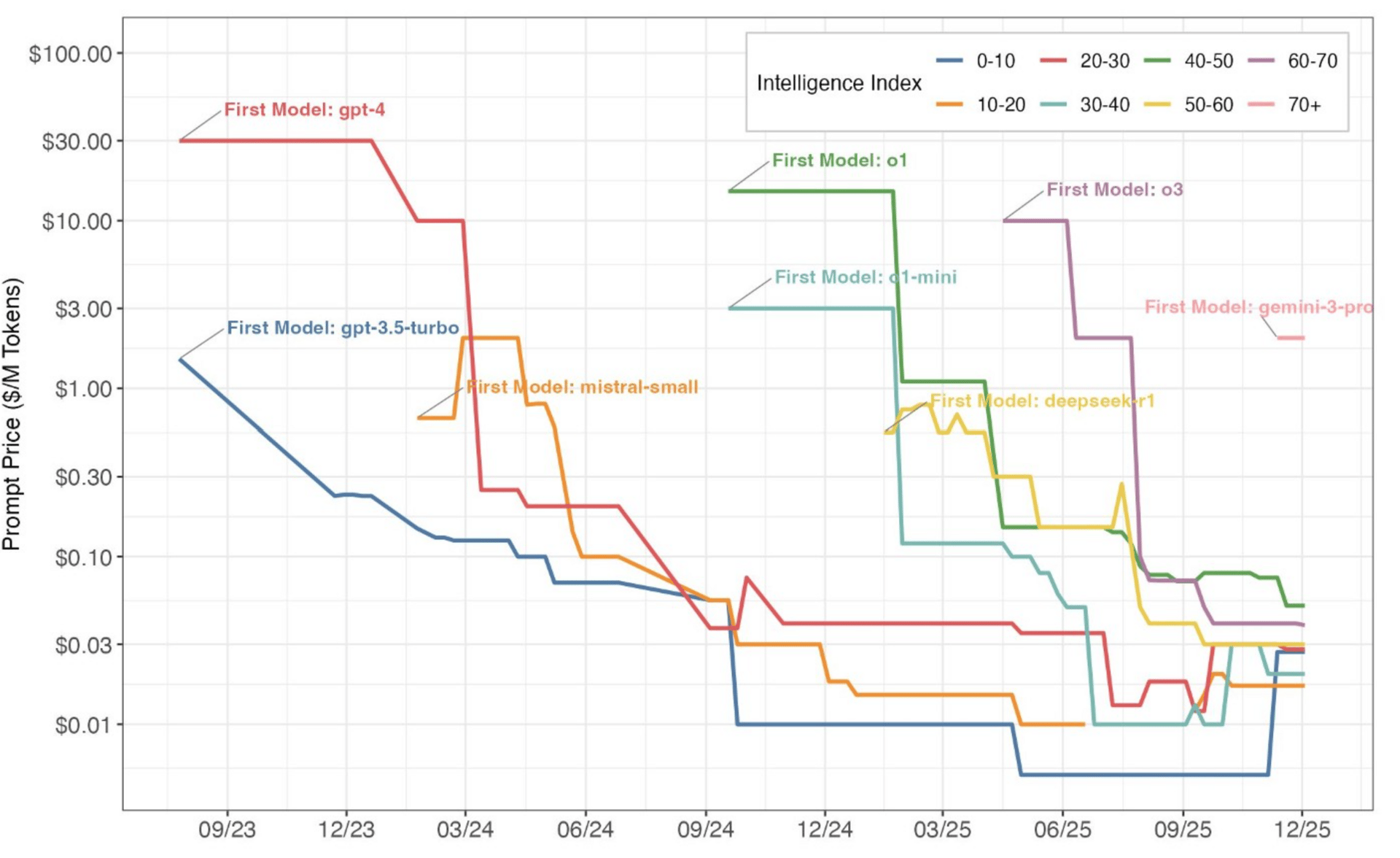 An excellent compilation of the latest data on the LLM market points to plunging LLM prices, exploding open source supply, continued enterprise dominance of commercial models, fast turnover in frontier models, and more.