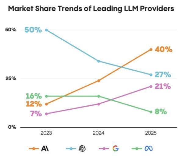 Menlo Ventures' latest report on GenAI in enterprise has many interesting findings, including Anthropic soaring to 40% of the enterprise LLM market. This is significantly due to coding taking the lion's share of enterprise departmental LLM spending - $4.2bn out of total $7.3bn - which is where Claude has been a standout leader.